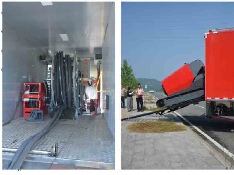 移動(dòng)排水泵站及液壓系統(tǒng)放置室:車廂中段用于停放液壓裝置、液壓油箱及放置油管絞盤。車廂后門為下開(kāi)式,行車時(shí)作為后門,保護(hù)車內(nèi)設(shè)施,當(dāng)子車下車時(shí),可作為其階梯,使子車平穩(wěn)上下車。